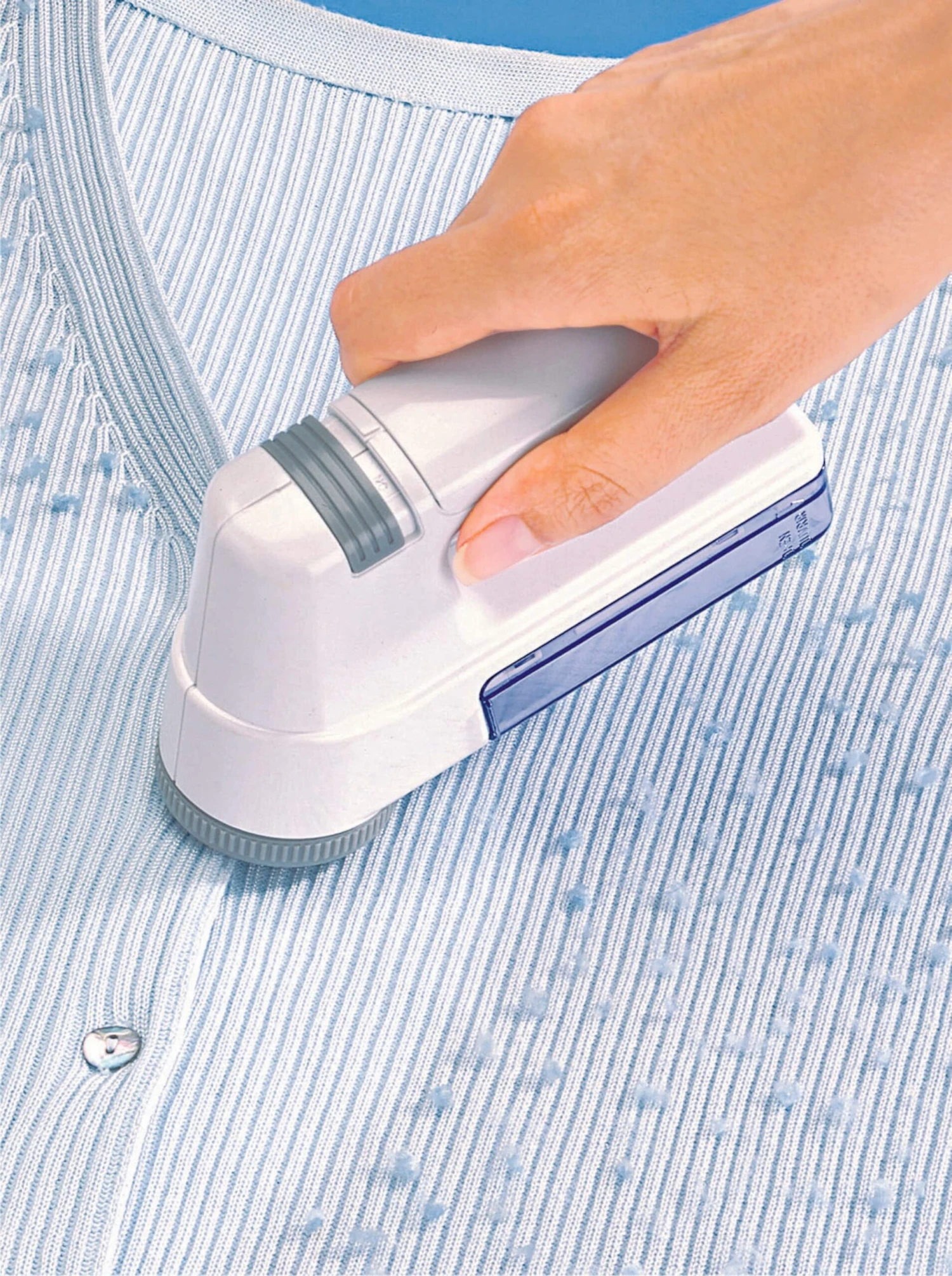 Der Woll-Rasierer entfernt Knötchen und Fusseln. Scherblatt und Scherkopf Edelstahl. Batteriebetrieb. Inklusive Reinigungspinsel.