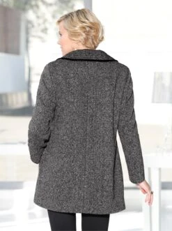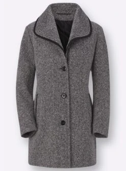 Winterlich wärmende Jacke in hochwertiger Tweed-Qualität. Klassisch geschnitten mit Kontrastblenden und Ziernähten am Spatenkragen und an den Taschen. Dekorative Schmuckknöpfe. Schulterpolster für eine schöne Silhouette. Langarm.