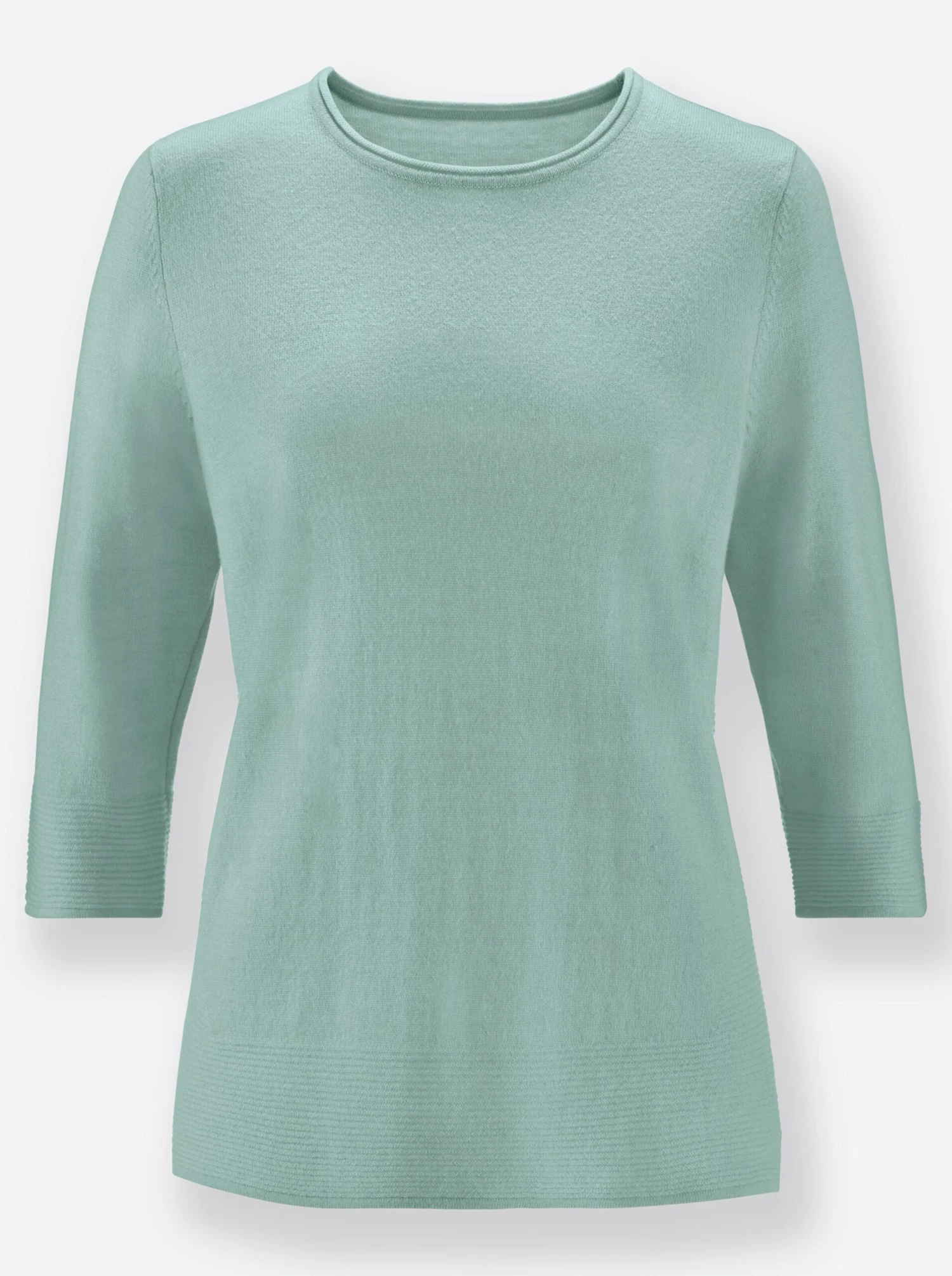 Kuschelweicher, hochwertiger Feinstrick! Der in Form gearbeitete Pullover besticht durch den Rundhals-Ausschnitt mit Rollkante und die dekorative Querrippenblende an den 3/4-Ärmeln und am Saum mit Seitenschlitzen